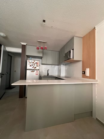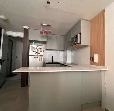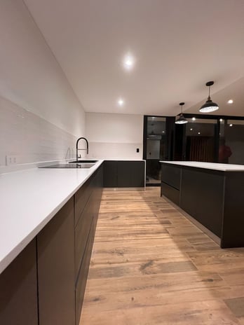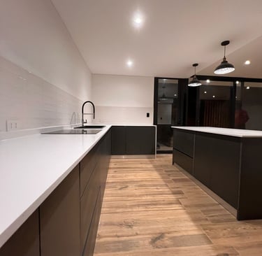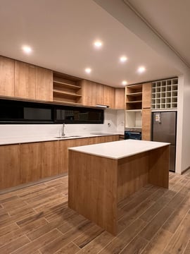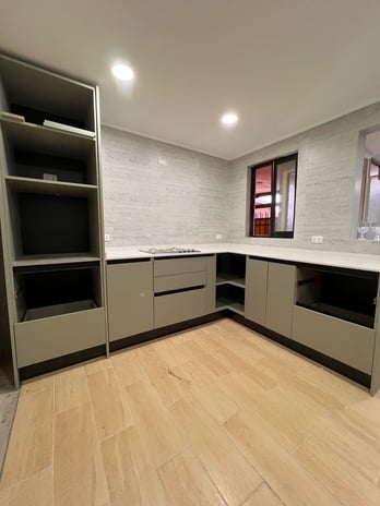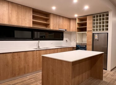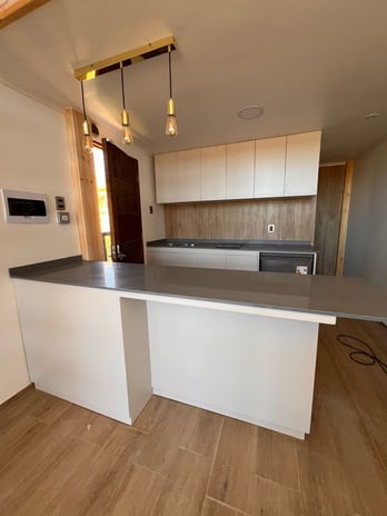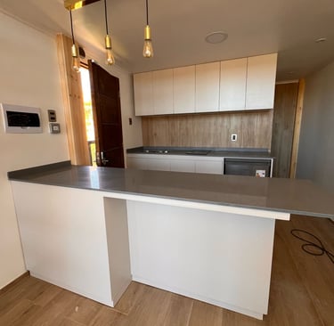 Mobiliario en melamina y cubierta en cuarzo blanco absoluto para un ambiente cálido y elegante.